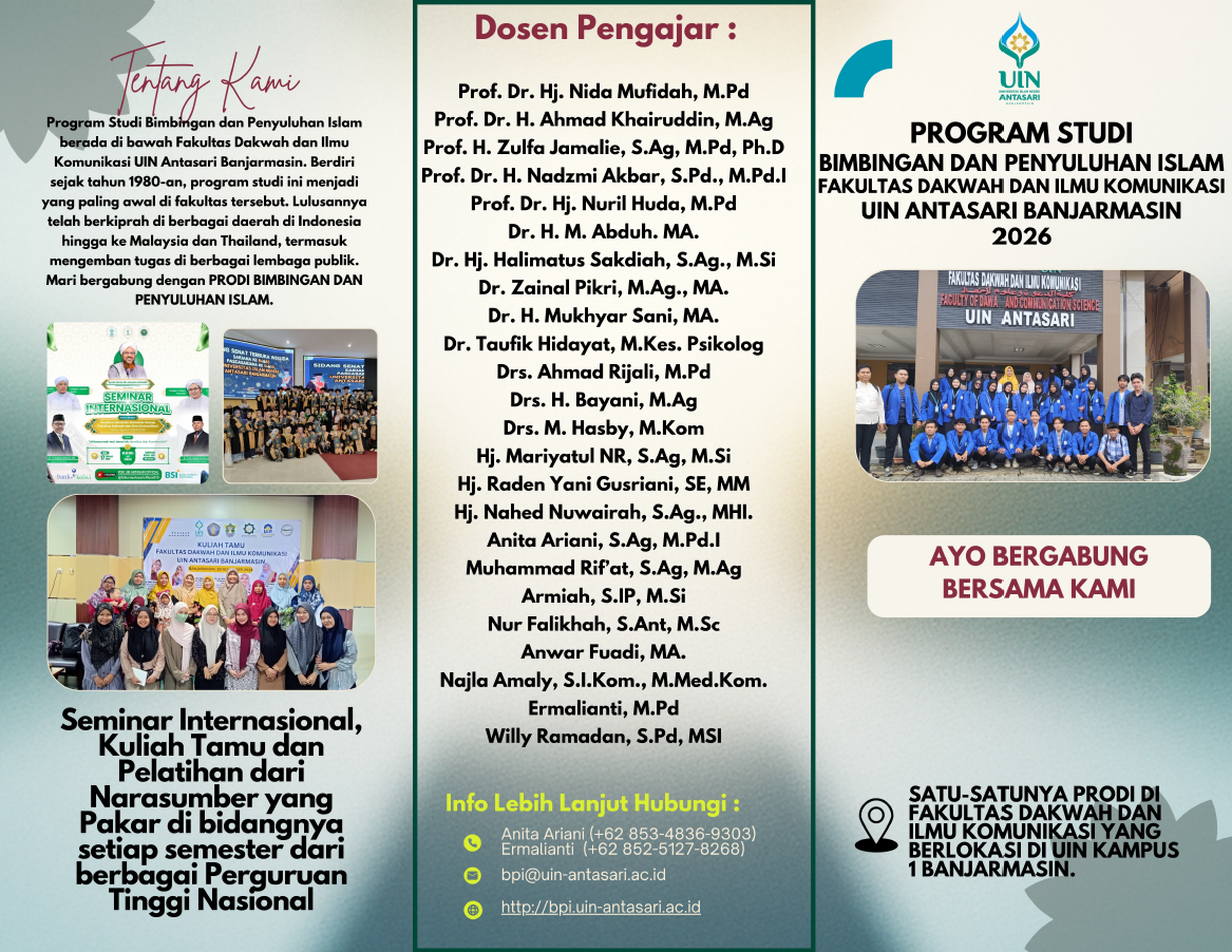 Bimbingan penyuluhan Islam merupakan Prodi yang jarang ada di Indonesia, sehingga punya potensi untuk melahirkan lulusan yang dapat dipekerjakan di berbagai bidang, sebab BPI dapat masuk ke berbagai bidang keislaman. Disisi lain, di Indonesia Guru Besar bidang ilmu penyuluhan Islam juga tidak terlalu banyak. BPI di FDIK UIN Antasari Banjarmasin punya banyak lulusan yang sukses berkarier di berbagai bidang, selalu di unggulkan di berbagai kegiatan, sehingga sudah saatnya menunjukkan dan menampilkan diri lebih kepada masyarakat umum