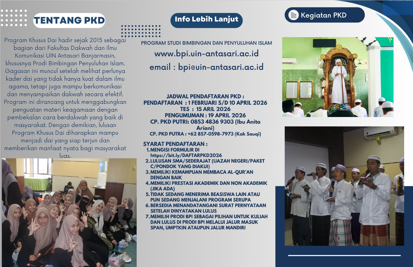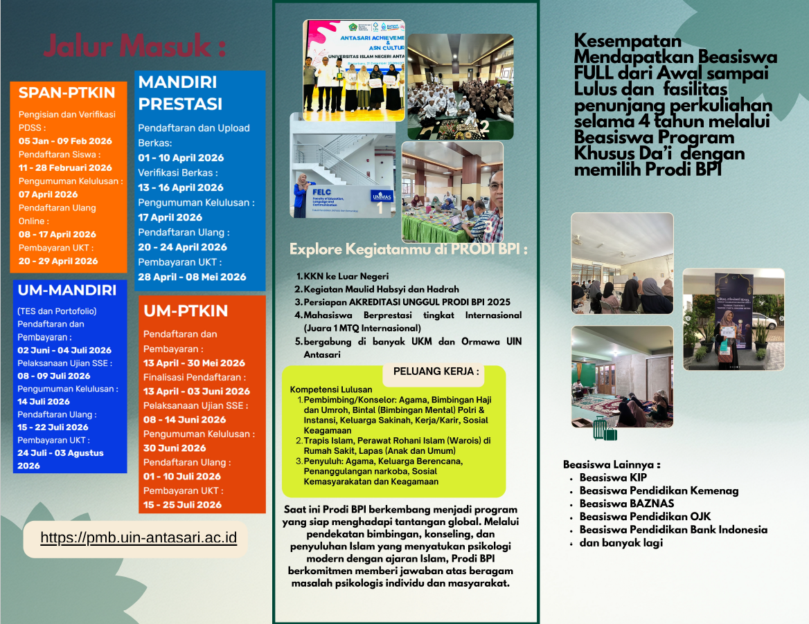 Sama seperti Penerimaan Mahasiswa Baru lainnya di UIN Antasari Banjarmasin, proses penerimaan MABA di BPI dibuka dengan 3 gelombang penerimaan, biasanya dilakukan pada bulan Mei-Juli, jadi bagi kamu yang berminat untuk masuk ke BPI silahkan untuk rajin-rajin membuka websitenya uin tepatnya di : https://pmb.uin-antasari.ac.id/